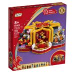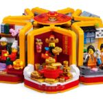 The final scene depicts Choy San, the God OF Prosperity. The figure has a new torso print and uses a sloped skirt piece to depict a robe. This is also a new print in this set. The head has a wink and a smile. The scene shows gold ingots and “yuanbao” (ancient Chinses ingots resembling a boat with a lump in the middle) These are done using a gold hotdog bun with a gold stud, there is also a large red pot. There is a printed lamp showing a tiger and a printed 2×4 red tile as decoration.